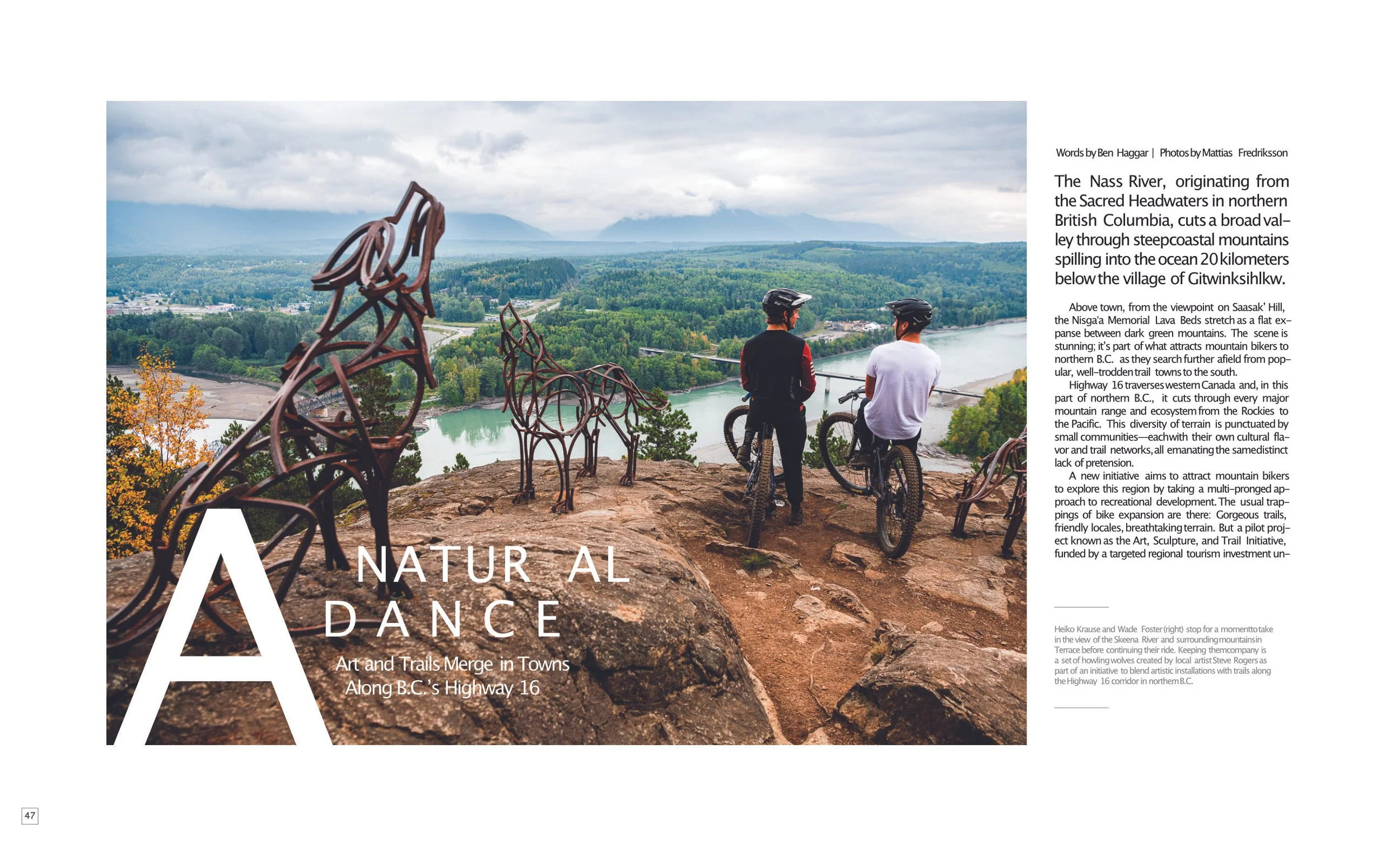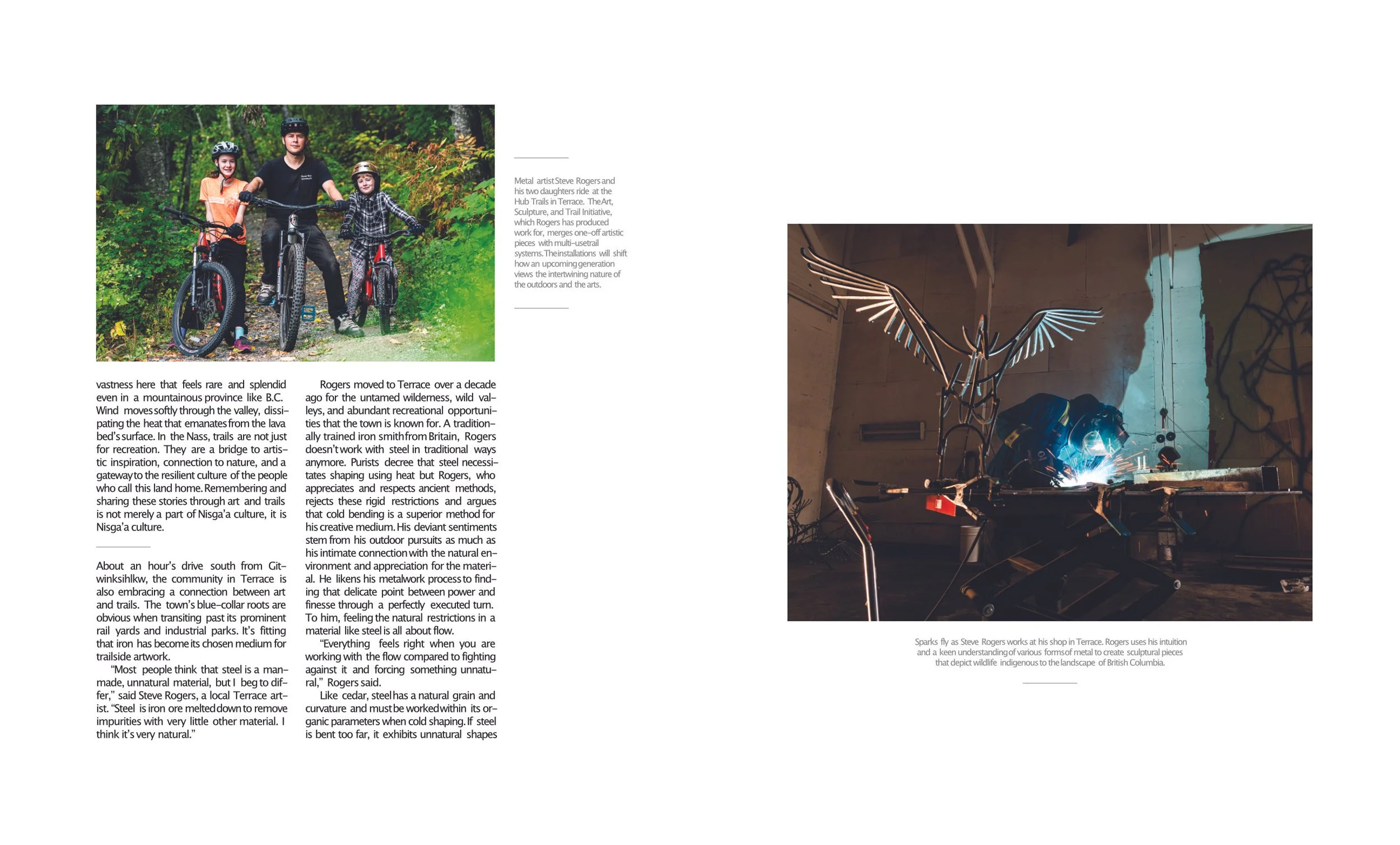 Terrace, BC – Great Bear Ironworks, an artisan studio based in Terrace, BC, is proudly featured in the latest edition of Freehub Magazine, spotlighting their exceptional craftsmanship and dedication to public art. The feature article highlights two of their most significant projects: the Terrace Wolves installation and the creation of a giant Raven sculpture for the MTB Association of British Columbia (MTB-BC).